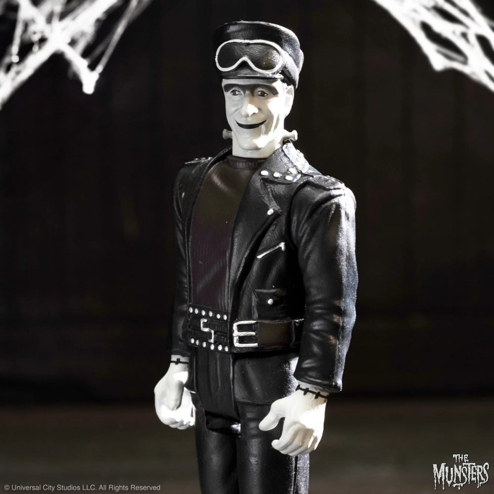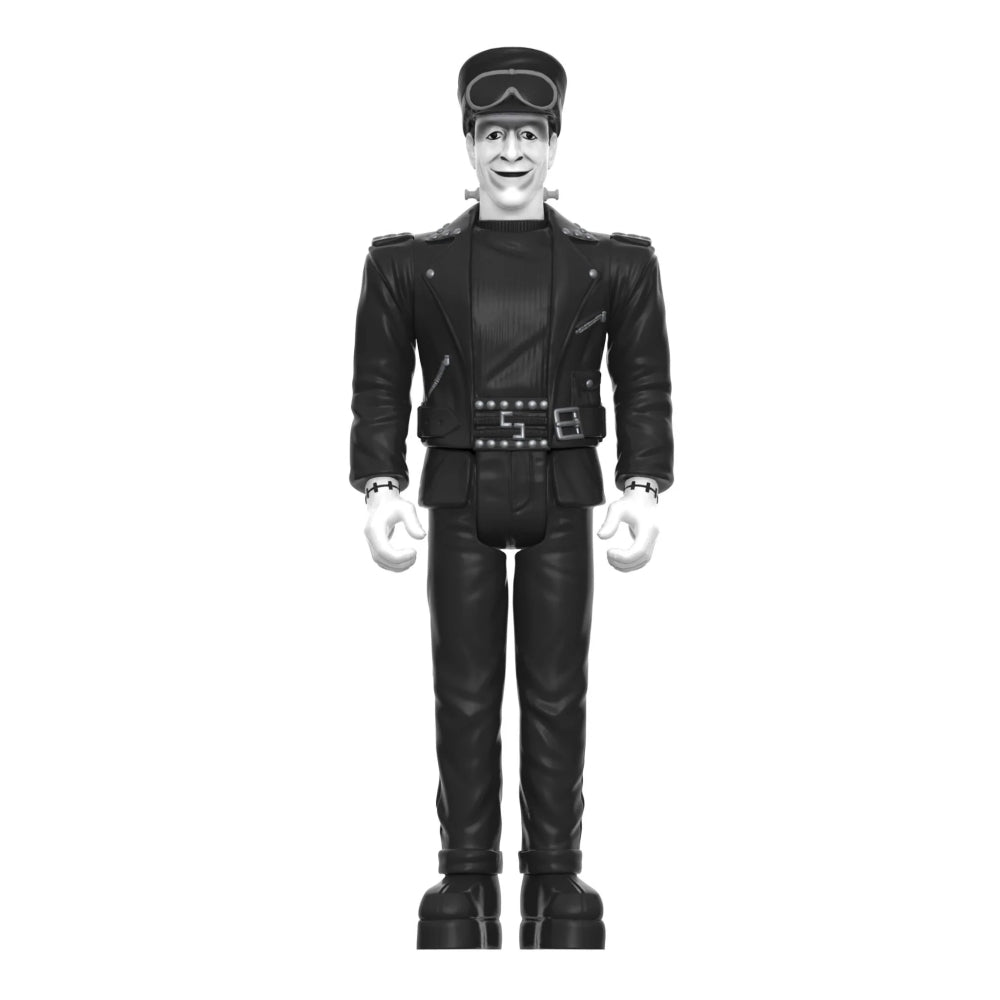 - This 4.1” articulated Munsters ReAction Figure of Hot Rod Herman is rendered in grayscale and shows the lovable lunk outfitted in head-to-toe racer attire featuring a “The Punk Rods” jacket with knife stab logo.